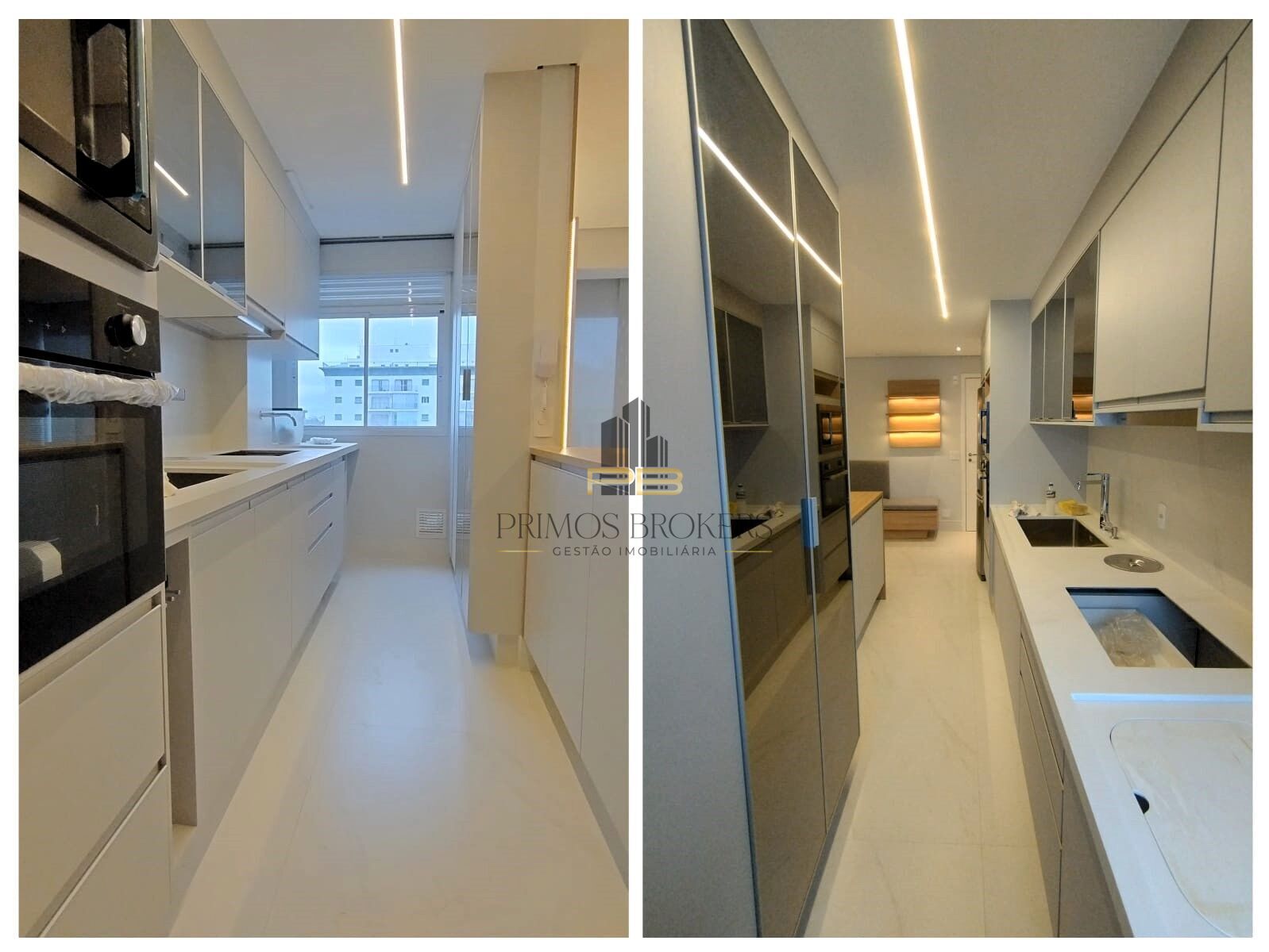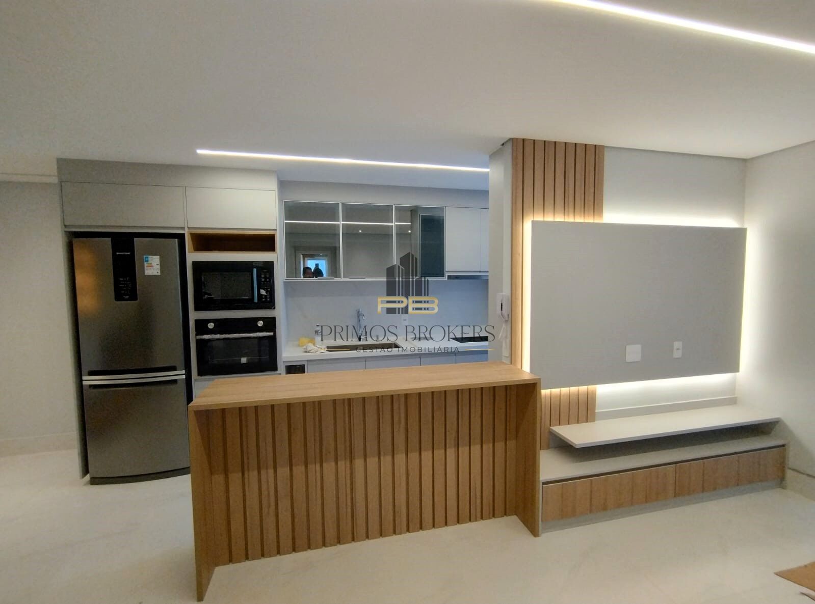 ☕ Cozinha com armários planejados, geladeira, forno elétrico, forno microondas.